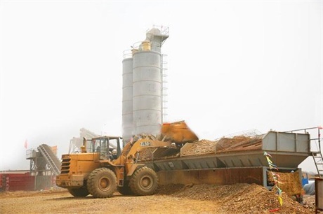 800型水穩(wěn)攪拌站、水穩(wěn)攪拌機的構(gòu)成: ①骨料配料供給計量系統(tǒng)————骨料斗、皮帶輸送機、水平皮帶機。 ②粉料供給計量系統(tǒng)————粉料倉、螺旋輸送機、螺旋電子秤。 ③供水系統(tǒng)————水箱、水泵、管路、閥門、噴水器。 ④攪拌裝置————攪拌機、電機、減速機。 ⑤儲料裝置————斜皮帶機、儲料倉。 ⑥控制系統(tǒng)————控制柜、顯示儀表、配電盤。 800噸水穩(wěn)碎石攪拌設備、水穩(wěn)層攪拌站使用方法: 工程所需骨料分別用裝載機裝入700噸水穩(wěn)碎石攪拌設備、水穩(wěn)層攪拌站各個料斗,開啟料斗閘門,骨料落到皮帶秤皮帶上,各皮帶秤按工程設定流量值自動定量連續(xù)稱量和輸送所需骨料,然后由水平皮帶機把骨料送入攪拌裝置,所需粉料由粉料倉經(jīng)螺旋輸送機送至螺旋電子稱,螺旋電子稱按照重量設定值自動連續(xù)的稱量出所需用的粉料,送至攪拌裝置內(nèi);攪拌用水由水泵經(jīng)過調(diào)節(jié)閥門及管路按工程所需水量送至加水器噴頭,均勻的噴灑在攪拌裝置內(nèi),進入攪拌機的物料在攪拌機內(nèi)相互反轉(zhuǎn)的兩根攪拌軸上螺旋漿片的攪拌下,受到漿片周向、徑向、軸向力的作用,使物料產(chǎn)生擠壓摩擦、剪切、對流,從而進行劇烈的強制攪合,并向出料口推移,當物料到達機內(nèi)出料口時,各種物料已相互得到均勻的拌合,并具有了壓實需要的含水量,此后均勻的物料由出料口落到斜皮帶機上,由該皮帶機輸送到儲料倉內(nèi),等待運料車到來后,由氣缸控制的斗門開啟,裝車后斗門關(guān)閉,成品料運往施工現(xiàn)場。